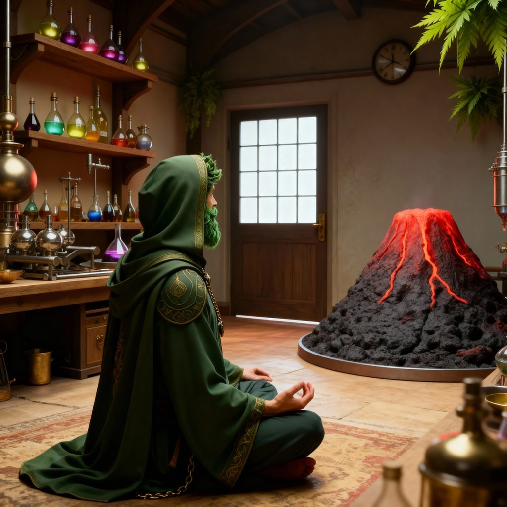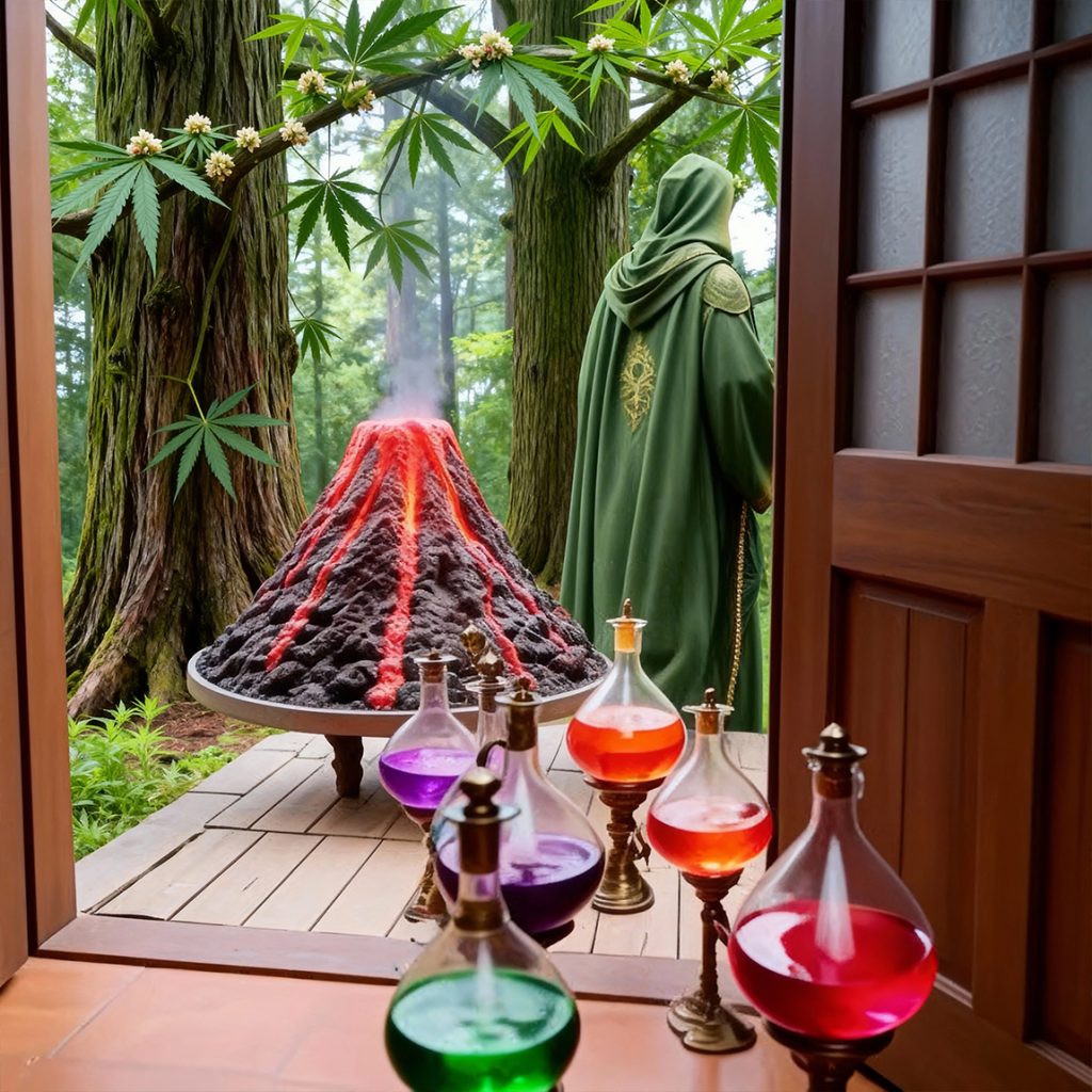 Ese día, cuando Maestro Puff entró en el laboratorio, notó una vibración extraña. Algo parecía diferente, pero no le dio importancia. Sus queridos terpenautas llegarían en breve para completar una nueva remesa de vapers que Chupito le había pedido para un evento que tendría lugar al día siguiente; y él estaba allí antes para que todo estuviese listo. Con un rápido vistazo, encontró el volcán central y lo llamó a su lado. Pero éste ni se inmutó. Intrigado, se acercó a él. A medida que se acercaba, la vibración de la entrada aumentó de intensidad. Claramente, su origen estaba en el volcán. Ese día no quería moverse de donde estaba.