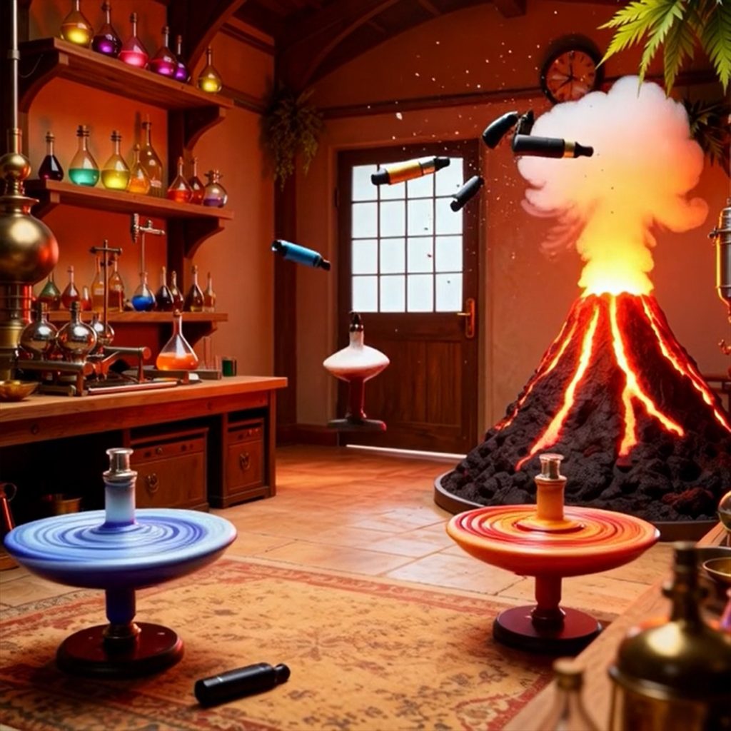 Las risas provocaron una reacción en cadena en todo el laboratorio: los vapers vacíos empezaron a saltar sin control mostrando su descontento, rebotaban unos contra otros, contra las paredes, contra el suelo, y contra cualquier cosa que encontraban en su camino; los cartuchos vacíos, se unieron a los vapers; también se unieron los vapers y cartuchos llenos; los matraces giraban sobre si mismos formando torbellinos de destilados y terpenos en su interior; y el volcán se puso en funcionamiento, sus paredes de lava viva, echando humo por la boca a lo loco. Maestro Puff y Chupito no podían parar de reír, y el bullicio en el laboratorio era cada vez mayor.