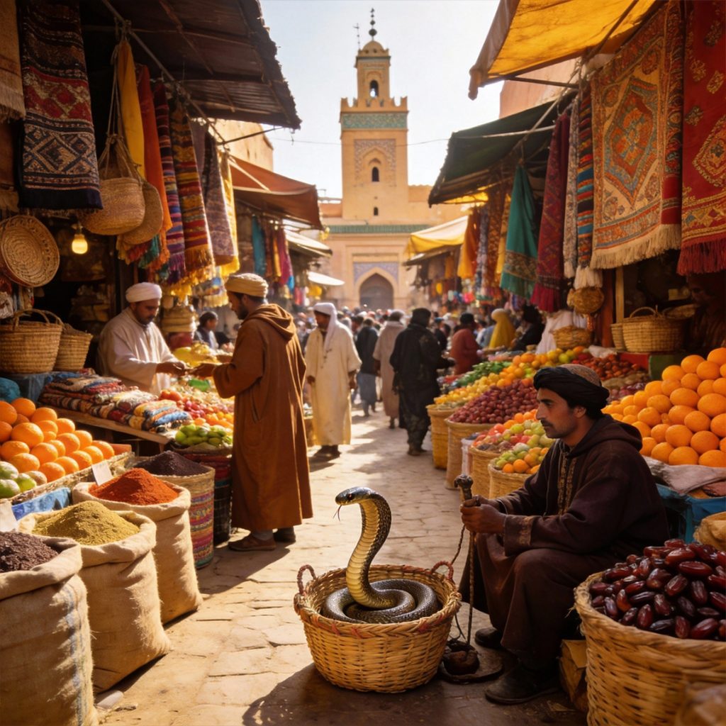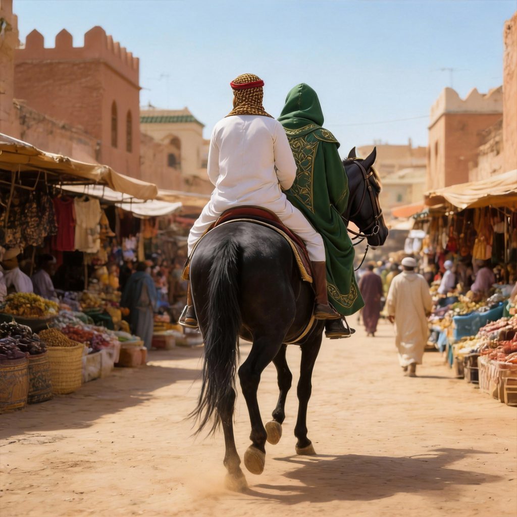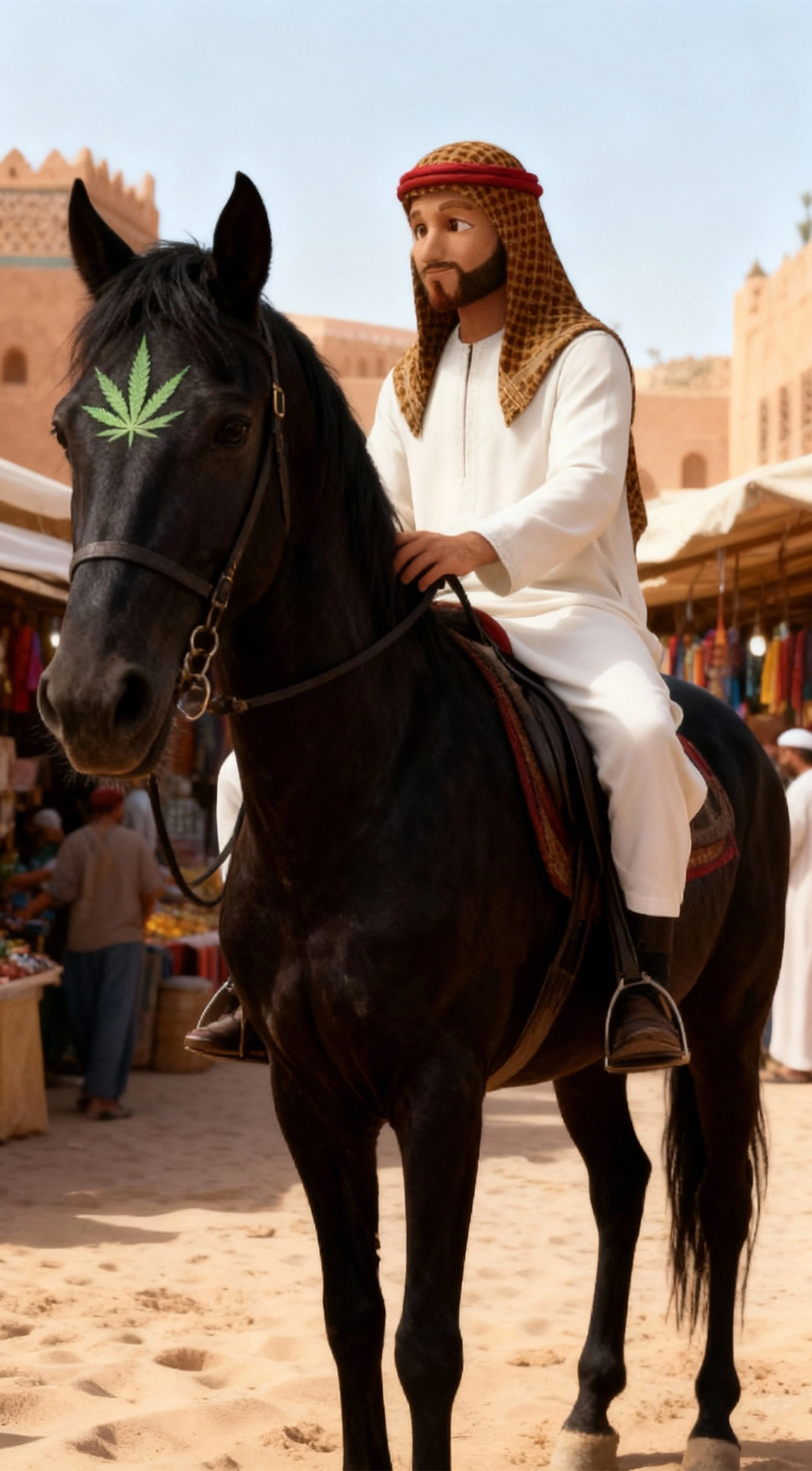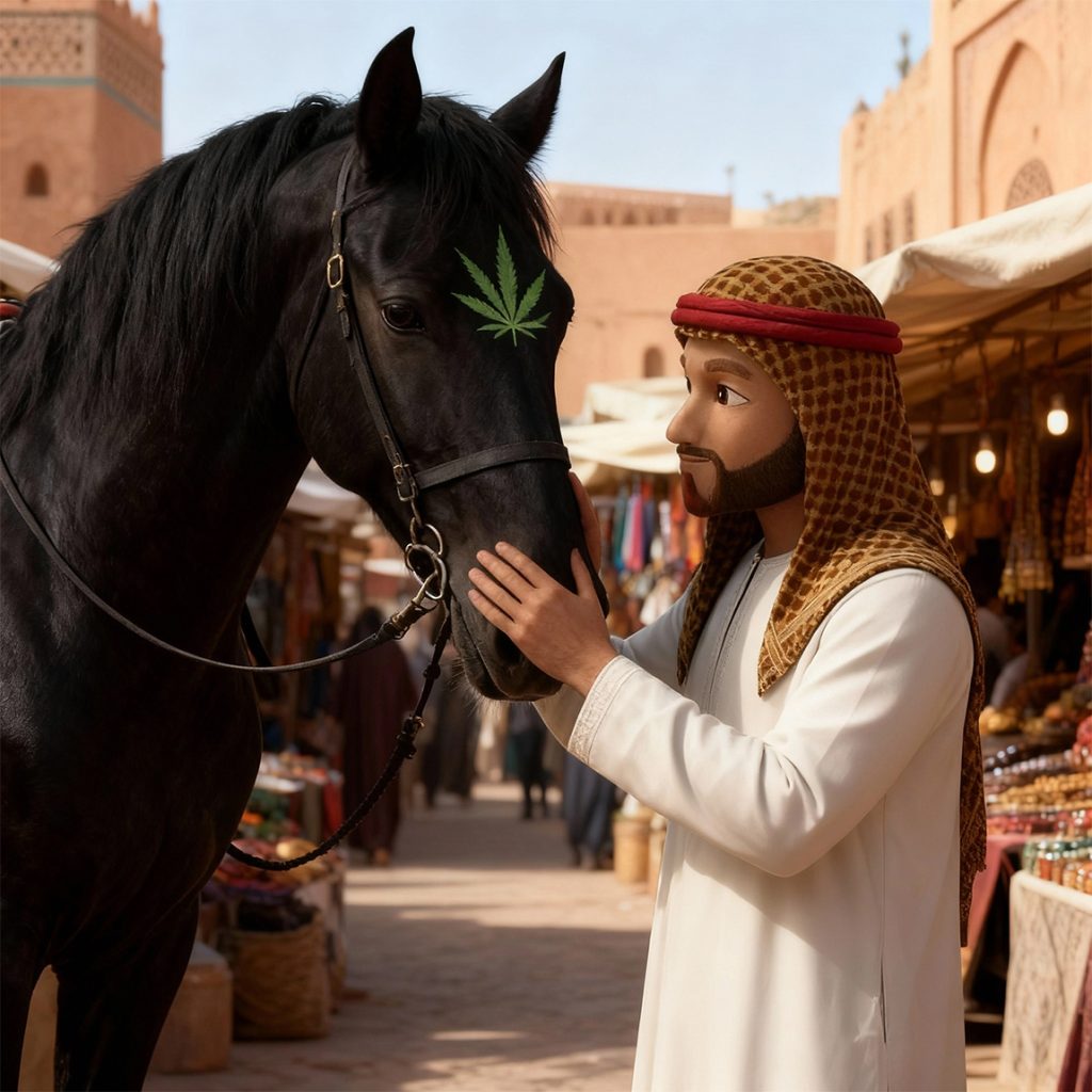 El mercadillo de Marruecos, como era habitual, estaba abarrotado de tenderetes y gentes diversas. Pasearon entre los puestos probando dulces y especias, adquirieron un par de túnicas nuevas, y llegaron por fin a la zona de venta de animales. Cuando los ojos de Moroccan se posaron sobre un corcel negro como azabache con una mancha más clara en la testuz que parecía hoja de cannabis, algo dentro de él le dijo que ese sería su nuevo amigo. Su intuición creció cuando al acercarse Maestro Puff a él y acariciarlo, el animal volvió la cabeza y su mirada pareció brillar con tonos verdes, y también su estrella pareció volverse verdosa por un instante.