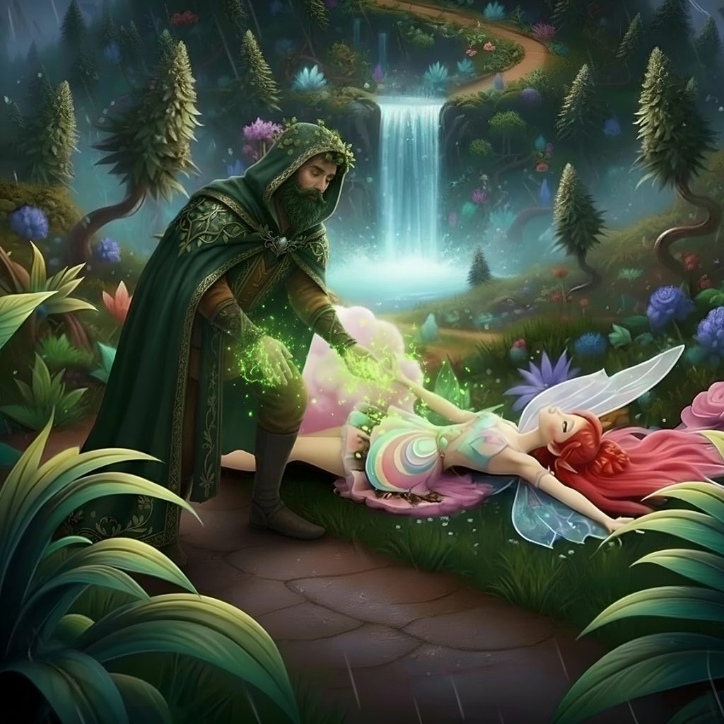 Su barba de capullos resplandecía con un fulgor cálido, y su túnica, tejida de hilos de luz, ondeaba con una elegancia serena que parecía desafiar la lluvia. Sus ojos, profundos como el estanque de la cascada, se posaron en Atomic Pop con una mezcla de ternura y sabiduría. Se acercó lentamente, el sonido de sus pasos ahogado por el chapoteo del río, y con una risa suave que parecía acariciar el viento, dijo: “Pequeña, tu fuego es hermoso, pero necesita guía. No temas, estoy aquí”. Su voz era como un bálsamo, calmando el latido acelerado de su corazón. “¿Quién eres?”, pudo preguntar. “Me llaman Maestro Puff”, respondió y extendió una mano firme. Una luz verde salió de ella, desprendiendo un aroma dulce y explosivo que llenó sus pulmones. Al inhalarlo, Atomic Pop sintió que su energía desordenada se estabilizaba, como si las tormentas de su interior se transformaran en un baile armonioso. Sus alas temblaron, y un débil “¡Pop!” escapó de sus labios, acompañado de una chispa tímida que iluminó su rostro empapado. “¿Cómo lo haces?”, preguntó, mirándolo con asombro. Maestro Puff sonrió y respondió: “Con amor y la esencia de este mundo, pequeña. Tu chispa puede brillar sin quemarse”.