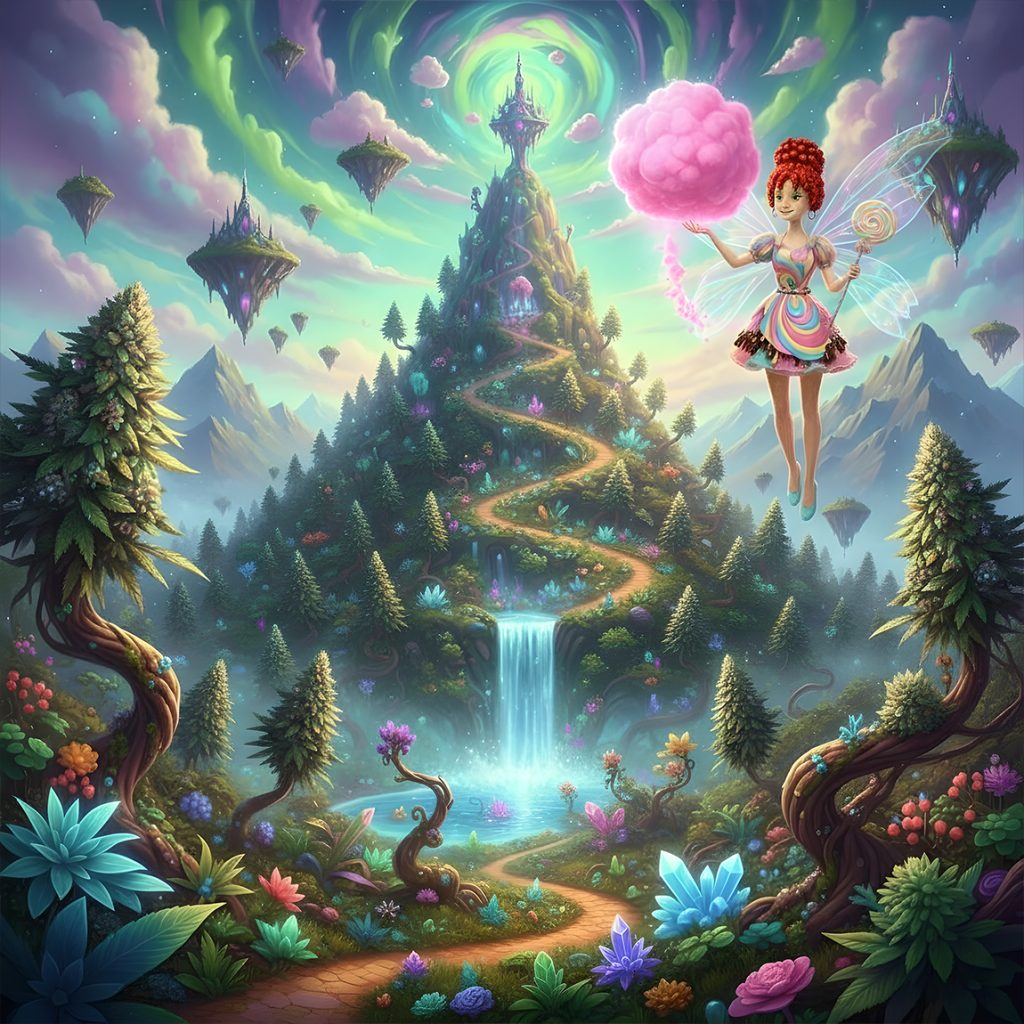 El Monte Kush se alza majestuoso bajo un cielo arremolinado de verdes neón y púrpuras, con islas flotantes de nubes algodonosas que parecían de azucar. Esta es la historia de cómo Atomic Pop, una terpenauta aniñada de espíritu explosivo, conoció a Maestro Puff, un encuentro que la enseñó a dominar su chispa en este mundo delicioso.