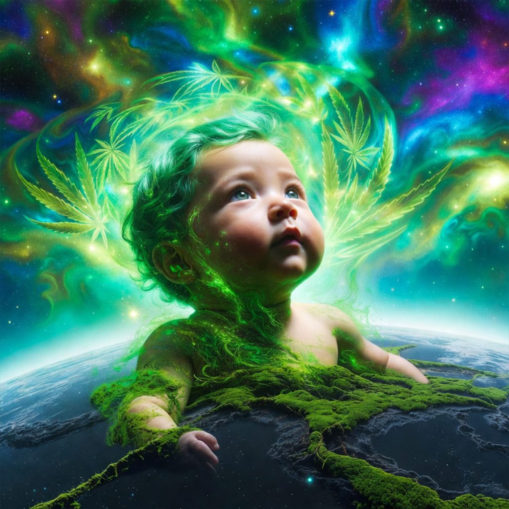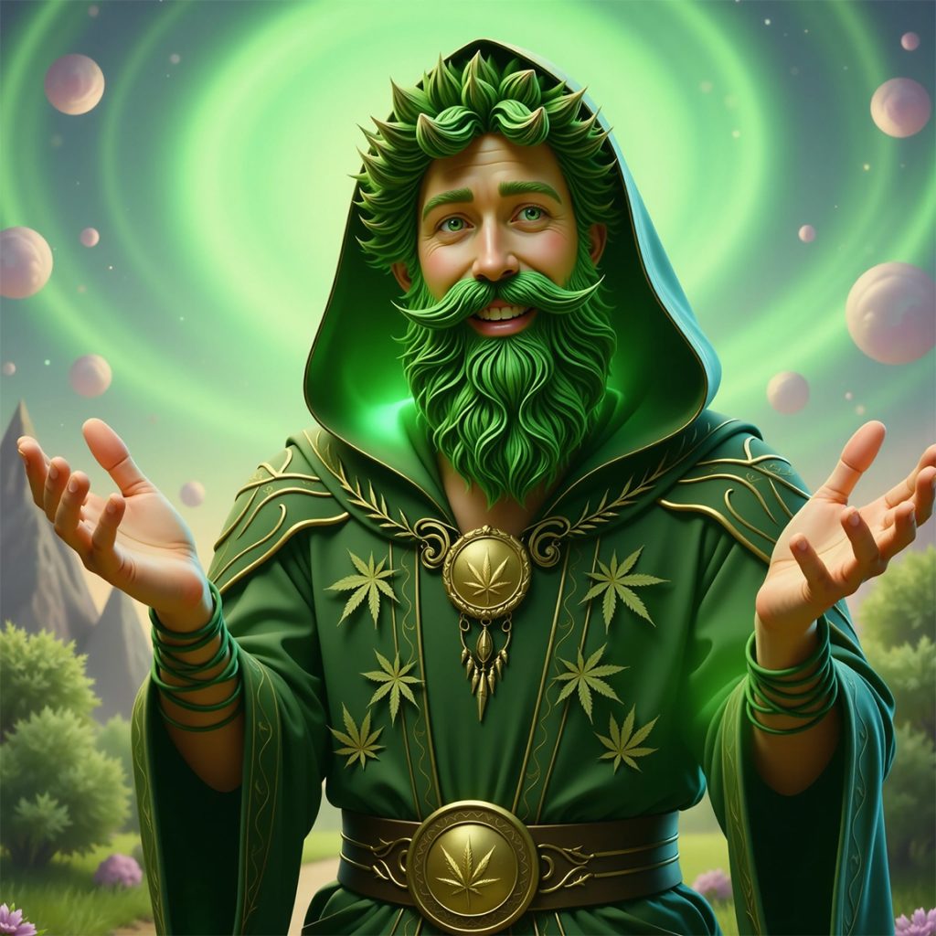 Cuando abrió los ojos recordó: «¡Eres El Guardian del Placer Verde!» había oído claramente durante su meditación y se había visto a sí mismo en un lugar en el que el centro era un monte de laderas exuberantes, cubiertas de bosques de cannabis que brillaban con capullos de verde esmeralda, púrpura profundo y dorado radiante. En ese lugar, el aire estaba impregnado de una niebla iridiscente que susurraba armonía, y los senderos de cristales luminosos asciendían hacia la cima, donde una cascada de luz líquida alimentaba un estanque turquesa rodeado de plantas parlantes. En el cielo arremolinado de verdes neón y púrpuras, había islas flotantes y nubes algodonosas. Allí estaba él rodeado de seres diversos, algunos que no era capaz de identificar con un nombre, que le pedían ayuda.