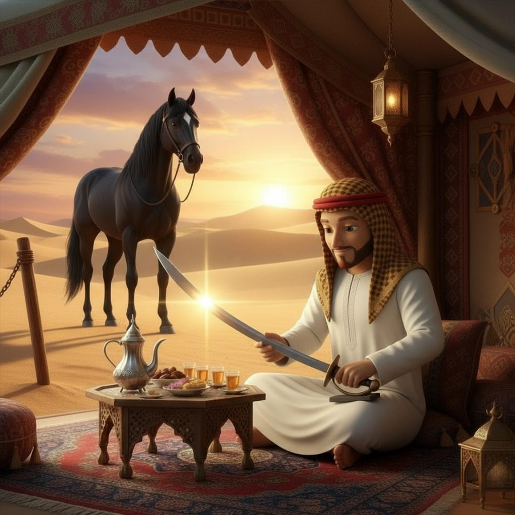 En las arenas doradas de aquel desierto, Moroccan cabalgaba con destreza sobre su caballo negro, su figura imponente cortando el viento con la gracia de un guerrero árabe. Sus ojos oscuros escudriñaban el horizonte con la intensidad de un combatiente y su espada relucía al cinto, un símbolo de su pasado.