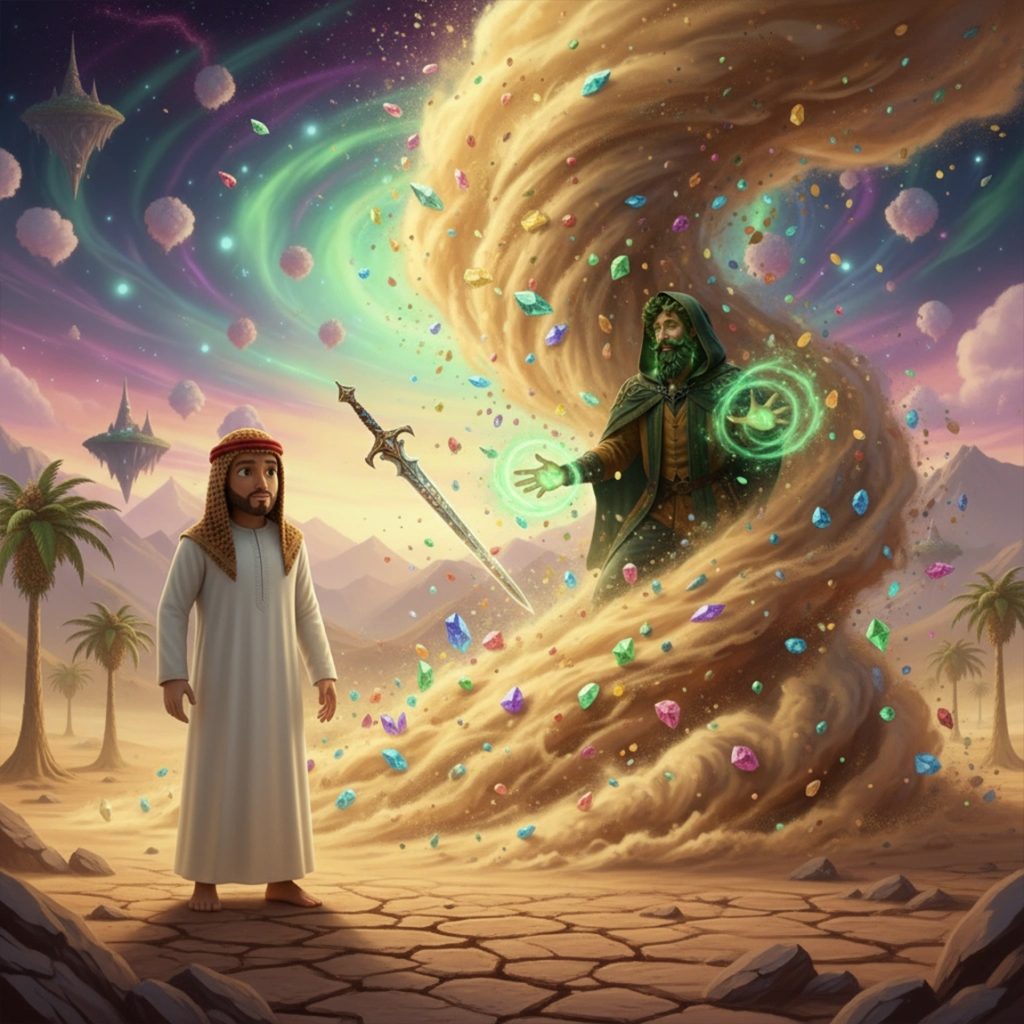 Desconcertado, Moroccan corrió tras ella, entrando en una tormenta de arena y cristales flotantes. De pronto, un resplandor cálido disipó el caos. Maestro Puff emergió de la arena, su túnica verde y púrpura brillando como un amanecer místico, bordada con capullos dorados. Su barba y su cabello de cannabis relucían, y los cristales a su alrededor vibraban con su presencia.