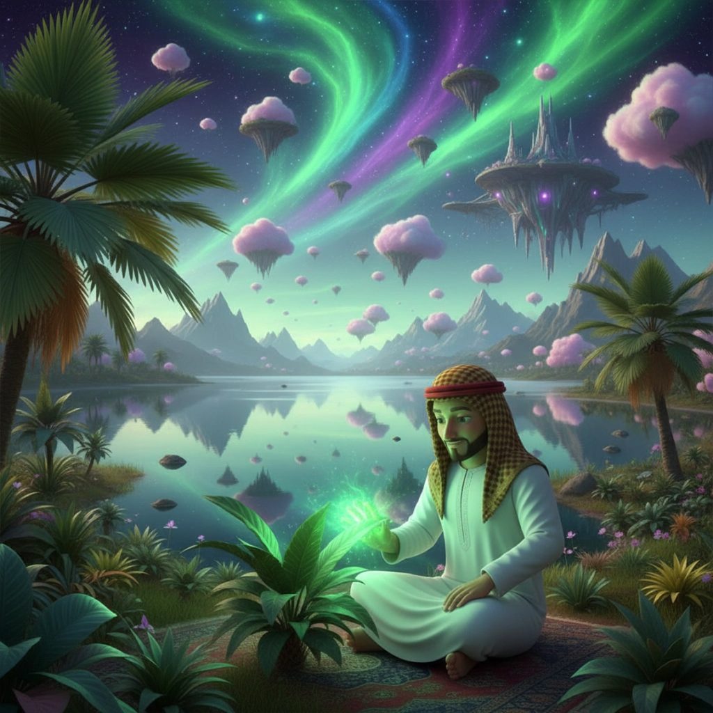Tras horas de cabalgar pasando de isla flotante en isla flotante, desmontó en un oasis oculto, donde se sentó bajo una tienda de tela brillante, sorbiendo té especiado y saboreando dulces con una tranquilidad ganada. El aroma de hachís – terroso, afrutado y especiado – lo cubría, un eco de su herencia. «¡Salam!», murmuró, dejando que la paz del lugar lo envolviera.