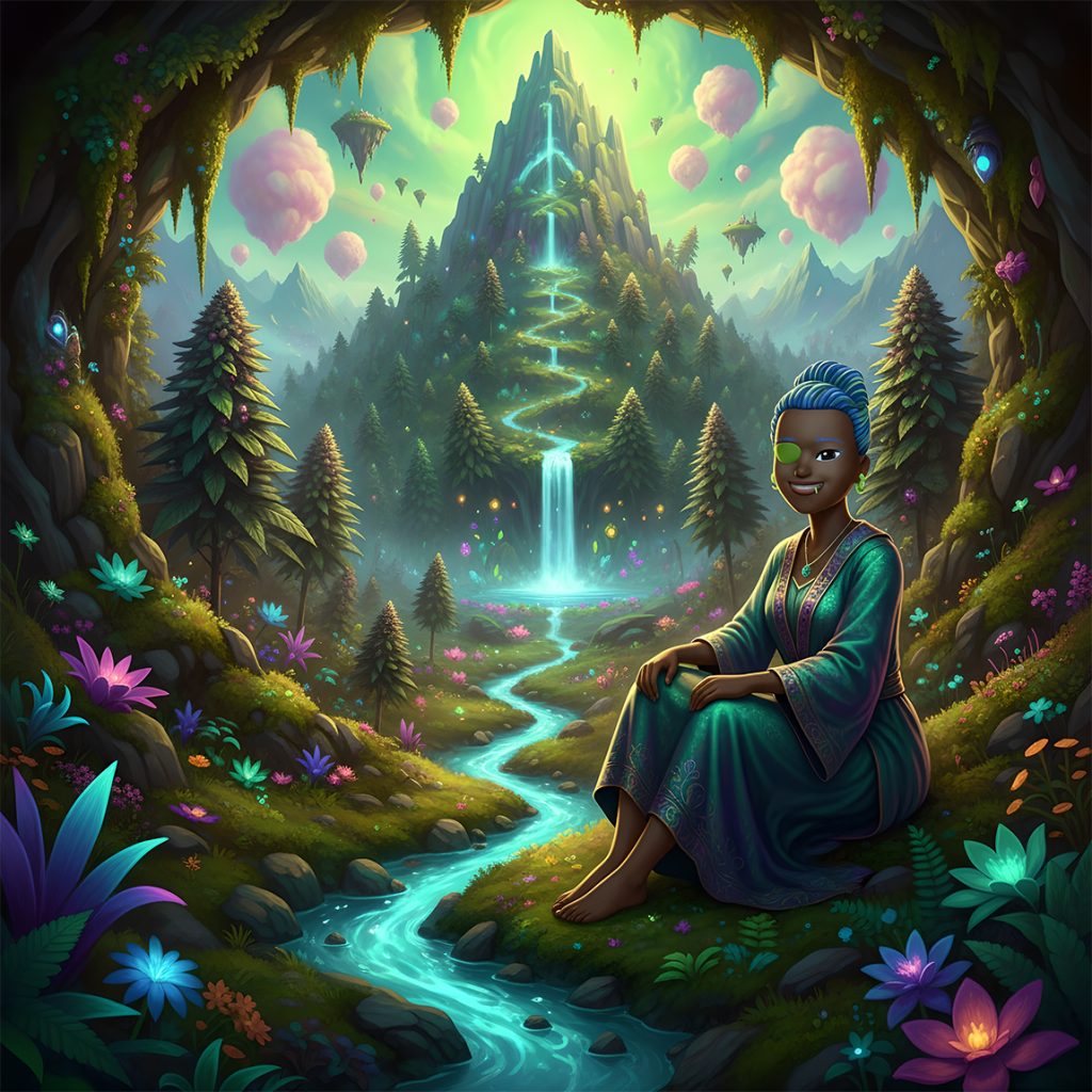 Esta terpenauta (más sobre los tepenautas) vive en una cueva que guarda un bostezo profundo; allí atrae la humedad del ser. Su quietud cuida la tierra sedienta, un regalo de serenidad para el monte. Con su cabello azul rizado y un parche misterioso, su presencia en la cueva oculta ofrece consejos mágicos, donde su esencia de shunk, humedad y tierra detiene el tiempo y trae euforia en la quietud absoluta.